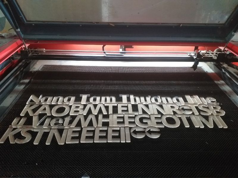 Cắt chữ inox, nhôm, đồng để làm bảng hiệu, chữ nổi thương hiệu, logo công ty là một trong những ứng dụng phổ biến nhất. Các sản phẩm được cắt bằng laser luôn đảm bảo:
